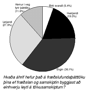 Þegar á heildina er litið er óhætt að fullyrða að bærilega hafi til tekist. Líflegar umræður urðu á netinu um hlutverk umsjónarkennarans og einnig urðu umræður í skólum þátttakenda meðal kennara sem ekki tóku þátt í námskeiðinu. Eins þjálfuðust þátttakendur heilmikið í notkun tölvusamskipta. Verið var að prófa nýja samskiptaleið í fræðslustarfi skrifstofunnar, sem var að mörgu leyti frábrugðin þeim sem höfðu áður verið reyndar. Sumt hefði að sjálfsögðu mátt fara betur og er ýmist um að kenna skipulaginu eða óvana þátttakenda og umsjónarmanna af svona vinnubrögðum. Eitt af því sem fólk saknar í tölvusamskiptum er líkamsmálið. Það er tvennt ólíkt að ræða saman augliti til auglitis eða skiptast á skoðunum skriflega um tölvunet. Það að sjá ekki svipbrigði á þeim sem maður er að –ræða• við getur verið skrambi erfitt. Að varpa fram spurningu í umræðum eða að koma með hana skriflega er líka ólíkt. Einnig fyllist fólk oft óöryggiskennd ef það fær engin svör við því sem það hefur fram að færa, það fær ekki einu sinni að vita hvort boðin hafi komist alla leið. Þarna kom glögglega í ljós að sömu lögmál virðast gilda hvað varðar sambandið milli virkni þátttakenda og hópastærða í umræðuhópum á tölvuneti eins og í hefðbundnum umræðuhópum þar sem fólk er augliti til auglitis. Því stærri sem hópurinn er því fleiri óvirkir.